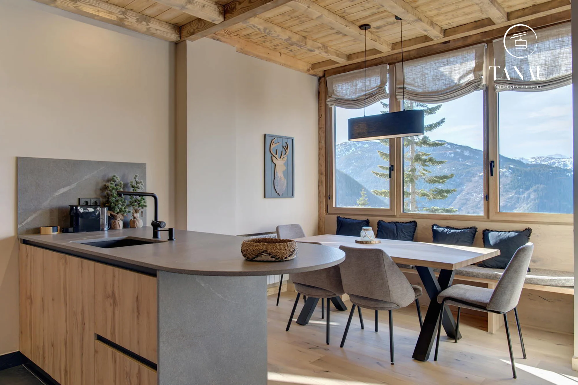 La zona abuhardillada de la planta superior ofrece un espacio adicional con capacidad para 2 personas, perfecto para relajarse después de un día en la nieve. El salón-comedor, con cocina abierta, está diseñado para disfrutar de la tranquilidad del entorno y cuenta con grandes ventanales que ofrecen vistas espectaculares a la montaña, haciendo del apartamento un lugar muy soleado y luminoso durante todo el día.