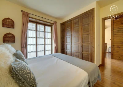 Dormitorio principal con cama de matrimonio, baño en suite y salida a una amplia terraza con jardín privado.