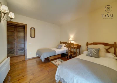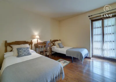 Dormitorio con dos camas individuales y acceso directo al jardín.