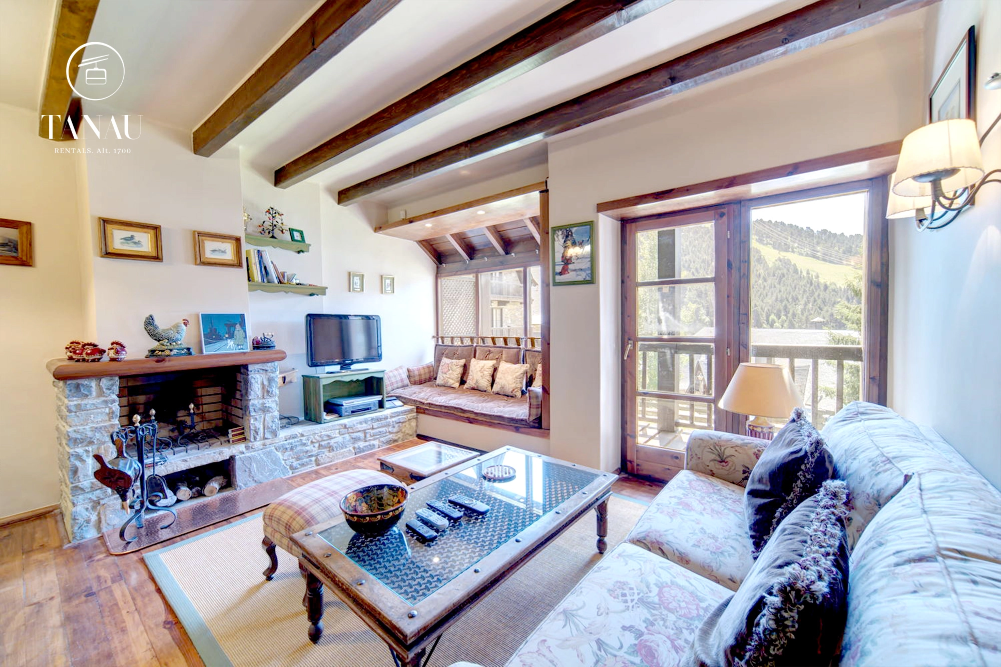 Su amplio salón-comedor, con una sofisticada chimenea como punto focal, se abre a través de un gran ventanal a un generoso balcón privado con impresionantes vistas panorámicas a las montañas y las pistas de esquí.